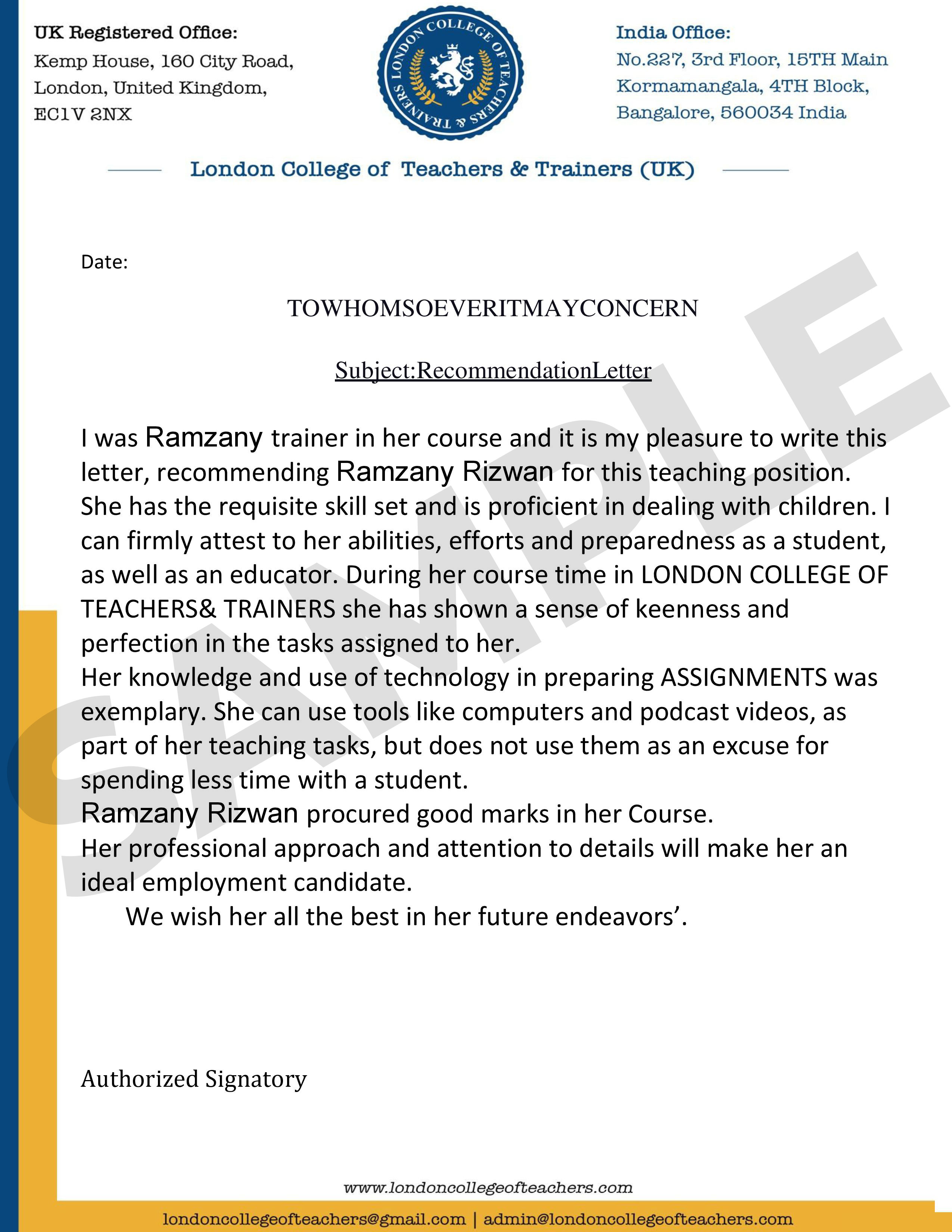 If you are having any preference for a certain school/institute/organization and you require a Letter of Recommendation, we would provide you the same depending on your performance level.